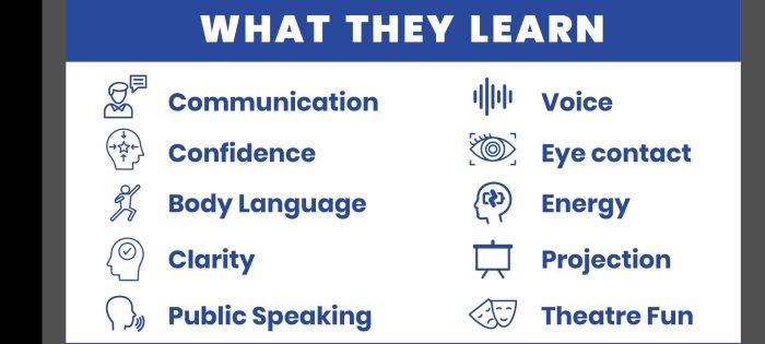 Perfect the art of performance through technique and discipline with focus on voice modulation, breathing, energy, eye contact.